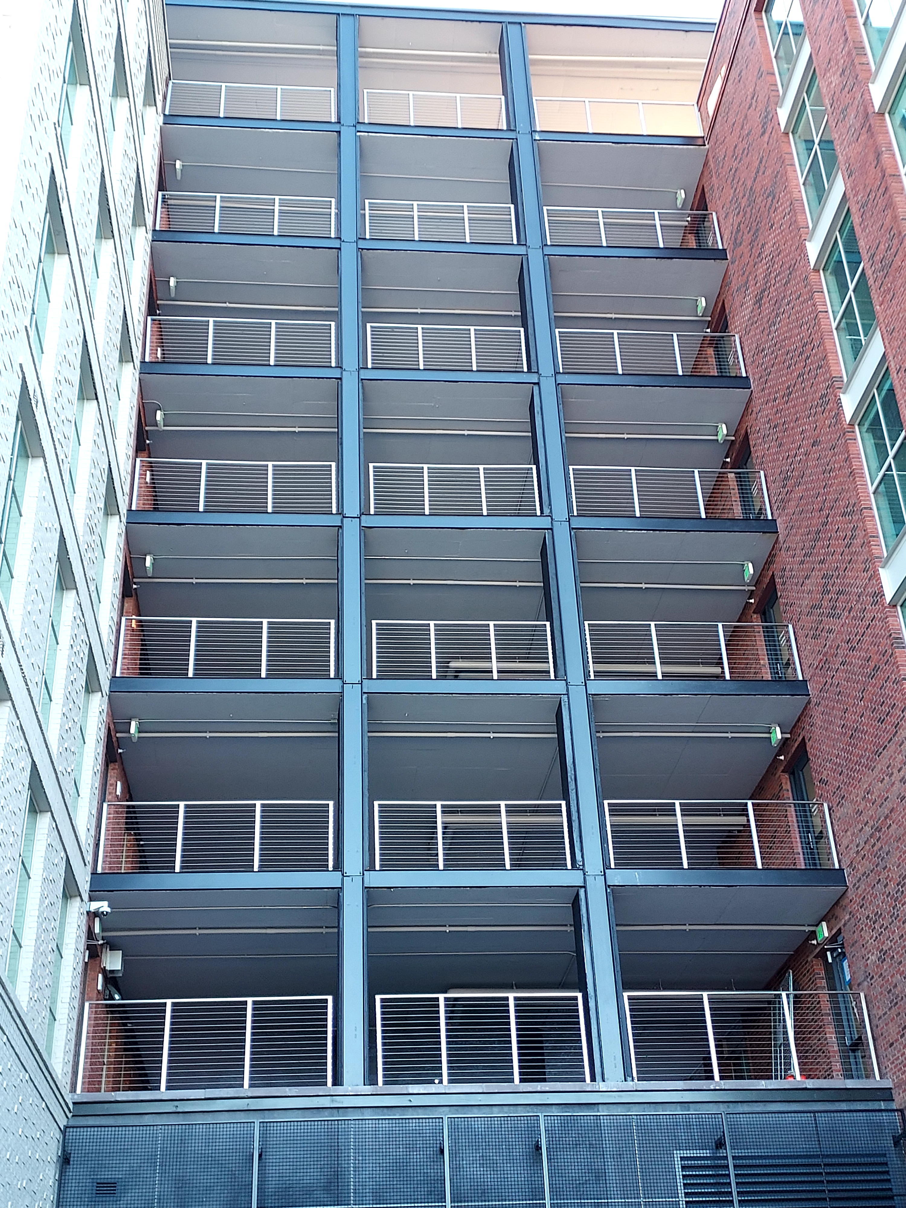 The basis of design was modified to accommodate each location and surface condition for commercial units, parking structure and 8 livable floors of units, encompassing bridges, unit dividers, balconies, pool deck and common spaces. The railings mounting needed to work with post-tension reinforced concrete, cast stone, brick, eifs, metal panels systems, steel channels and embeds.